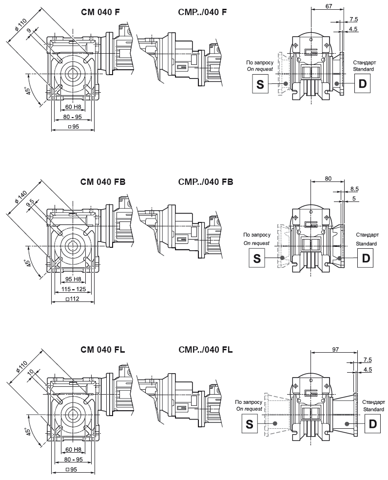 Вал редуктора CM040 полый диаметром 18 мм. В качестве опций с редуктором поставляются валы, фланцы и реактивные тяги. Окраска редуктора серая.